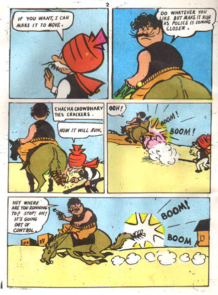 Chacha Chaudhary ties crackers - crackers! - to the horse's