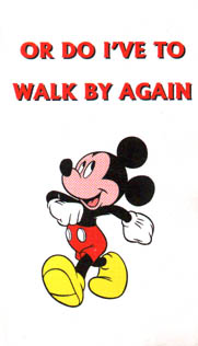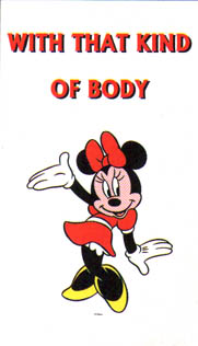 Whoa! Now entering sleaze zone. Lemme get this right... we're supposed to be checking out Minnie Mouse's body? Suddenly, my happy childhood memories of watching Disney Hour seem... violated. How are we supposed to ever look at Minnie the same way again, now that I've seen her posing like a Playmate for this picture? What's that white thing under her dress... are those her panties?? My god, what am I thinking... shoot me now! If the people responsible for making this card are reading this, I hope you're happy. I hope the blood money you made from selling this shit can help you drown out the knowledge that in the minds of children, a perfectly innocent drawing of a cartoon character is now forever associated with sluttiness.